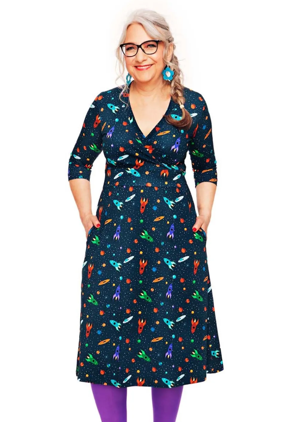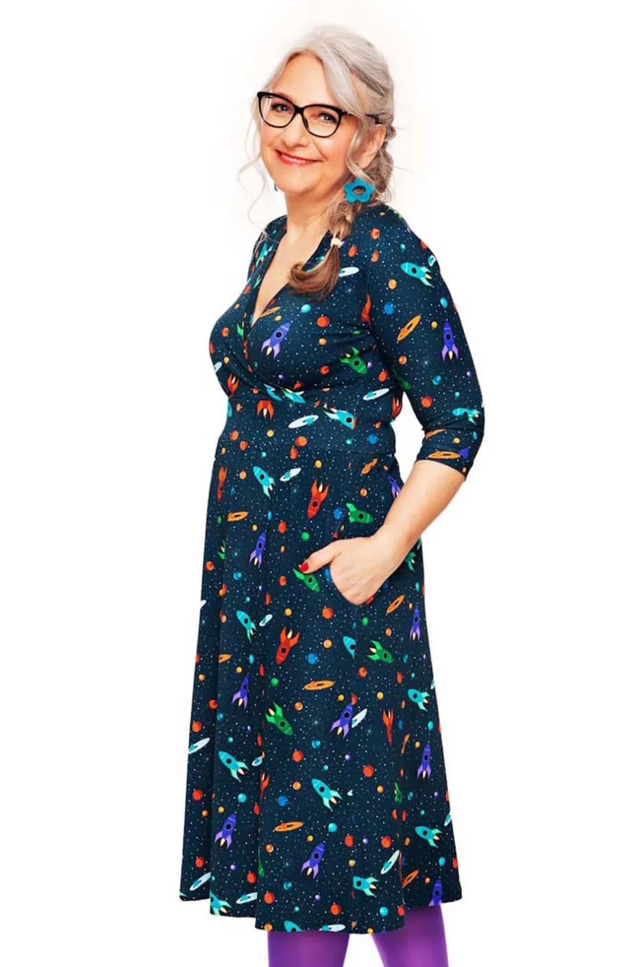 Vera är en välarbetad klänningsmodell med fina detaljer. Den har V-formad omlottringning, ett midjeparti och lätt rynkad kjol med fickor i sidorna. Längden är till nedanför knät och ärmen går till armbågen.